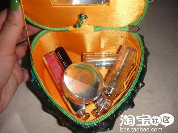 这款小绿心形的彩妆包 才花10米 便宜吧 我用它来装些 唇彩 口红 因为我平时很少化唇彩 所以买的也不多