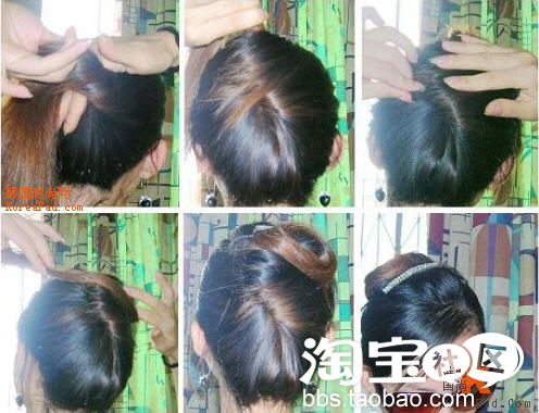 另一种复古式的盘发,和第6种的发式差不多,有一点小变化1、将全部的头发束在手中,提得高一点.