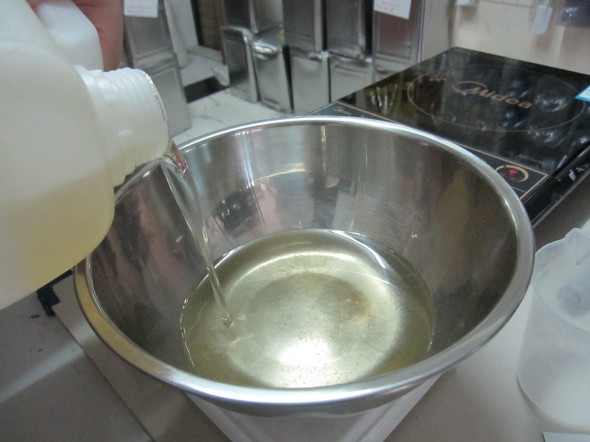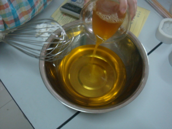 2.另外一个杯子里放入甘油、蜂蜡、杏仁油,搅拌。