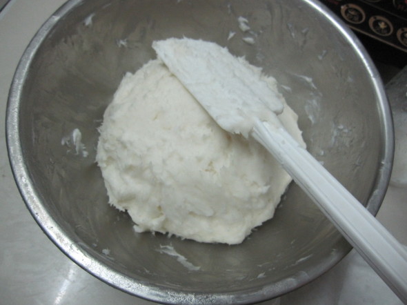 步骤:油碱混合搅拌出奶油状到面团状后,静置一周后(或蒸煮10小时后)加水溶解,加入乳化后精油,新鲜植物汁等即可。