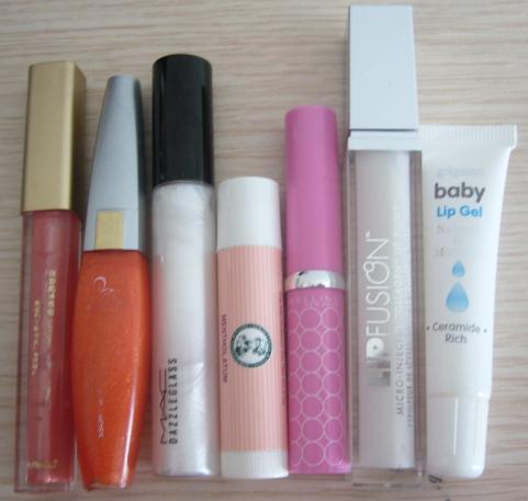 1十月天使唇彩、2???小英嫂子送的,不知其名,别看是橘色的,涂到嘴唇上特自然,3MAC唇彩,4曼秀雷敦唇膏,5美宝莲淡彩唇膏,6芙秀嘟嘟唇彩,据说含胶原蛋白,功能挺多的,价钱嘛也忒贵,7贝亲润唇啫喱,宝宝用的,孕期偶尔用一下下了,好用的:2、4、6