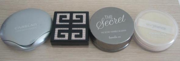 1是卡姿兰的粉饼,买了好几年了还没用完,性价比高,便宜还好用,2是纪梵希的四宫格粉饼,一时冲动败的,性价比不高,3是英文的高光粉,GOOD GOOD!!4是卡姿兰的散粉,也是买了几年了,估计5分之一都没有用到,也还说的过去,有点闪闪的