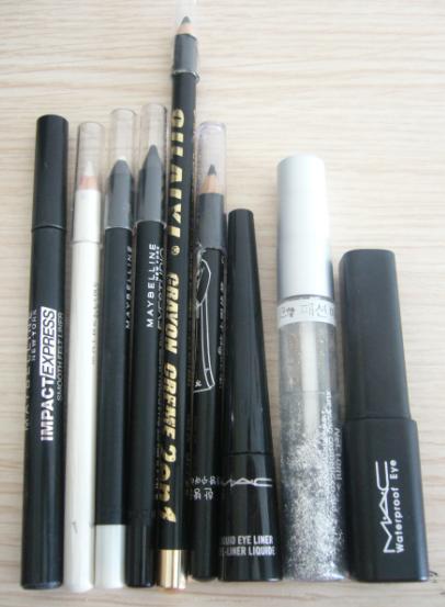 1美宝莲液体眼线笔,2美宝莲白色眼线笔,3、4美宝莲白色、黑色二合一的眼线笔,5、6杂牌子眼线笔,7MAC眼线液,8杂牌子亮晶晶眼线液,挺好玩,9MAC眼线液,里面最好用的是1、3、4、7、9