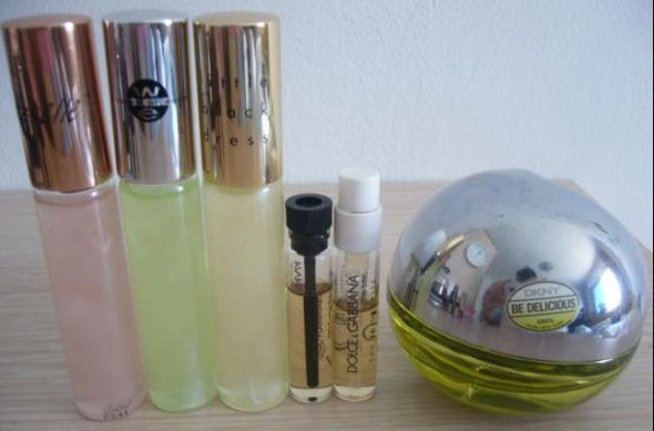 1雅芳的原真之魅、2地球女人、3小黑裙,可爱的小瓶子,最喜欢原真之魅了,带她的姐妹一并收购了,别看便宜,找到适合自己的味道才是硬道理,4.5丝芙兰购物所赠的大牌香水小样,6唐可那儿的香水,苹果味,清淡,最近又迷上了原宿娃娃,马上败来收藏,再上传图片