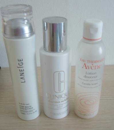 左一是兰芝美白的,买了还没用,不评价,中间是倩碧美白的,酒精味偏大了点,右边的是雅漾的,没刺激,但是放放会成分离状,不过用着还是挺润的,用之前多摇一摇