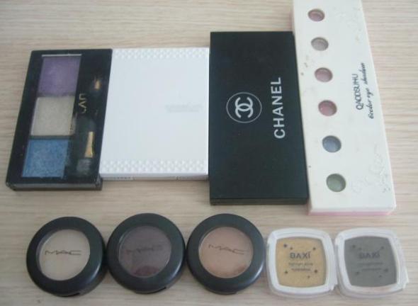 上边,1杂牌子眼影,亮的很,白色的用的居多,用来扫眉骨和眼窝,不错,2卡姿兰眼影,3香奈儿眼影,4巧迪尚惠眼影,下边,1、2、3MAC眼影、4、5杂牌子的不好上色,好用的:上2,,下1、2、3,其实眼影这东西,可以多买一些,搭配衣服用,不过提醒啊,好的眼影持久度高