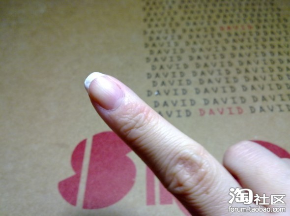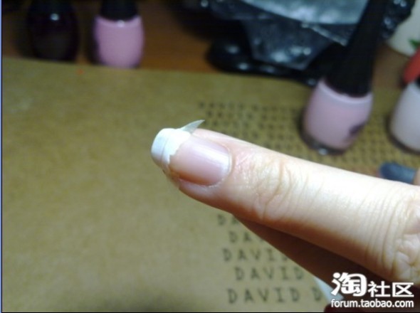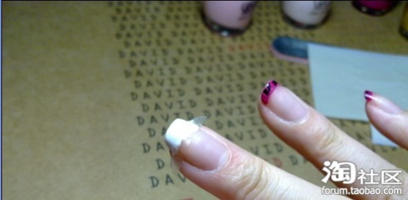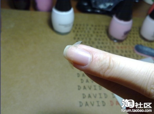 然后撕一个下来贴在指甲上,当然贴上去之后发现其实很平,不是很弯,弧度不够,这个时候就要自己适当的调整拉。一定要贴牢靠~~~