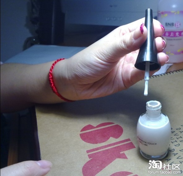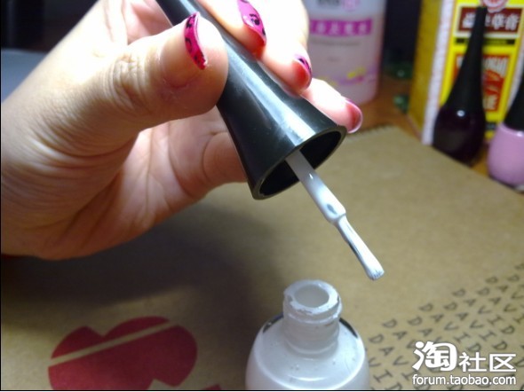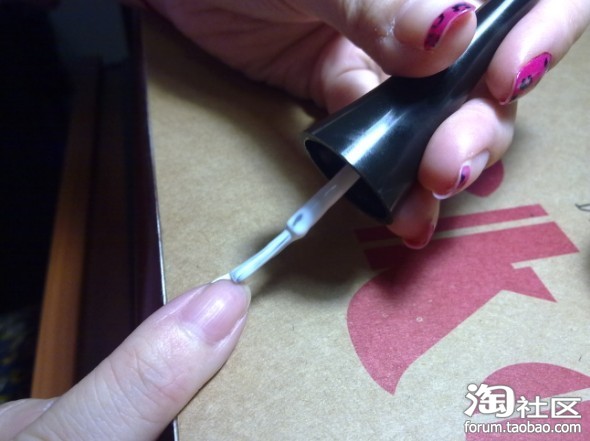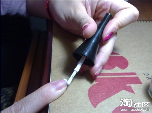 然后再把指甲油的刷子在瓶口在把多余的指甲油刮掉,因为过多的指甲油不方便掌握,而且一次画过去的时候可能会照成前面的指甲油很饱满,后面的很单薄。效果不好!