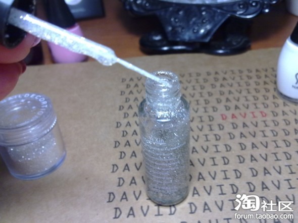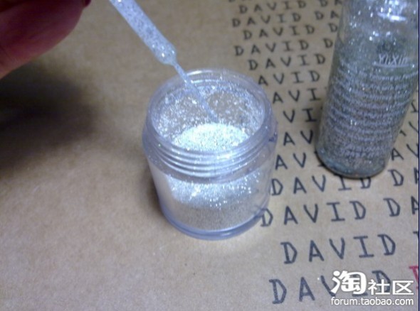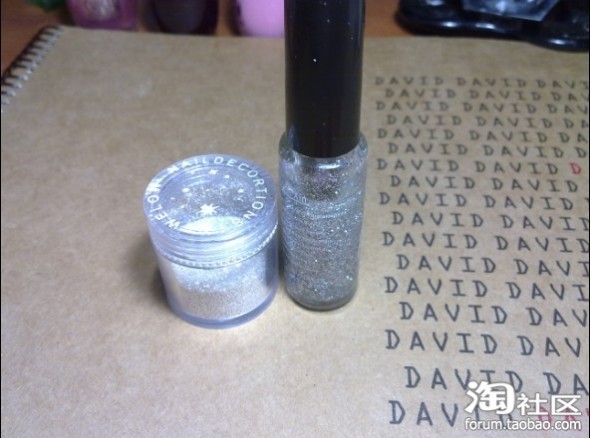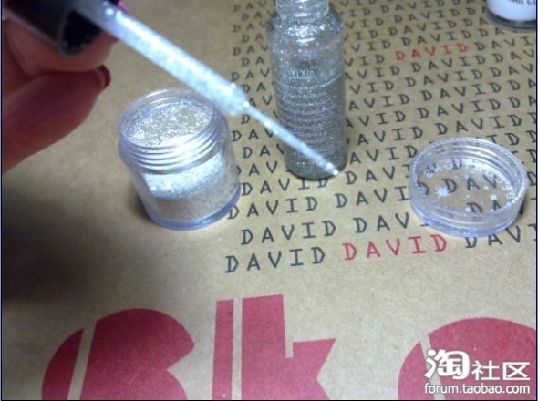 用之前的亮粉指甲油的刷子粘上一些小盒里的粉。。。