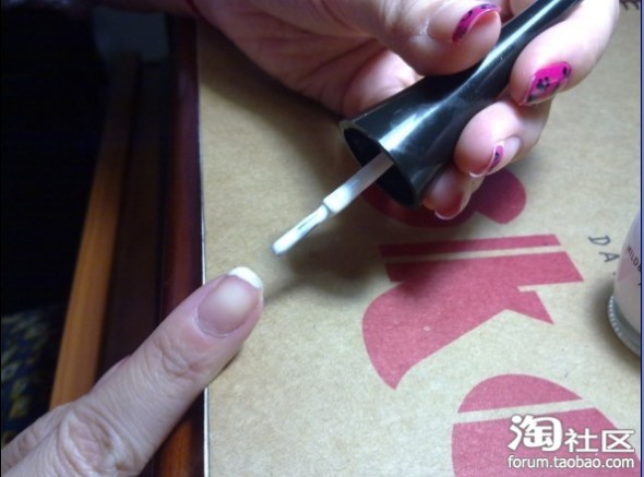好了,开始把刷子沿着指甲的边缘慢慢的一点点的画过去,宽度和弧度都是自己定哈,喜欢宽的就画宽一点,想窄就窄一些!