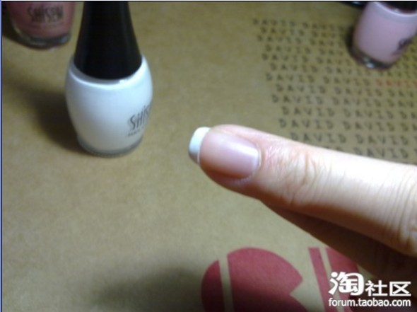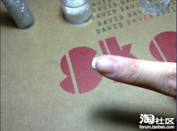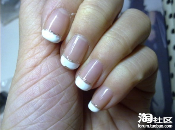 好了,现在呢,法式美甲也算完成了一大半了!如果喜欢简单的话,再上一层亮油就行了!呵呵,不过,如果再稍稍加点东西也是十分眼前一亮的,所以就再接着多加一些东西吧。不要眨眼哈,接着来。。。。