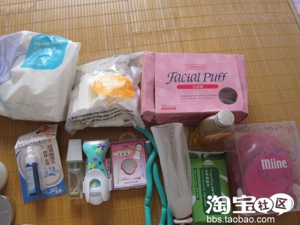 这些是用具 粉扑化妆棉 橄榄油 我的卸妆液用完的情况下我就用它卸妆 不过不太好洗 呵呵 资生堂的起泡网 能把洗面奶变成很细的泡泡 洗脸很舒服 还有去黑头的 去毛的 呵呵 大多购于屈臣氏...