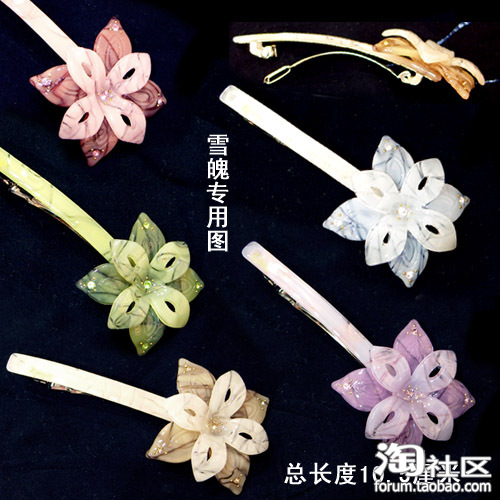 这些发夹色系都很标准,五大类:绿玉、烟灰、混红、紫瑛、米黄。头一个,貌似茶花 俺叫它茶花发夹