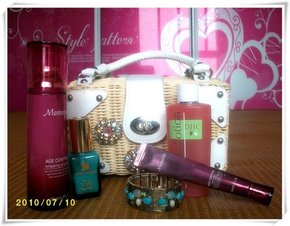 (从左至右:梦妆花颜凝时乳液、雅诗兰黛细嫩修护精华、梦妆花颜凝时眼霜、DHC樱桃果明化妆水)