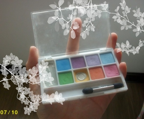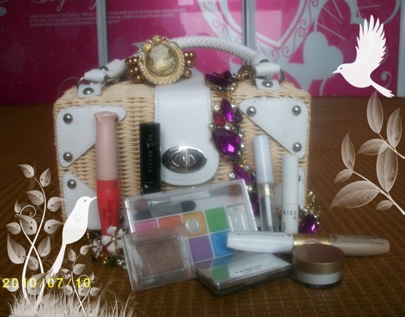 (从左至右:爱丽蜜桃唇蜜、卡姿兰金棕色眼影、巧迪尚惠多色眼影、查名猫睫毛膏、卡姿兰眉粉、创馨双头睫毛膏、DHC睫毛液、MIKA唇膏、MIKA家送银色闪粉)