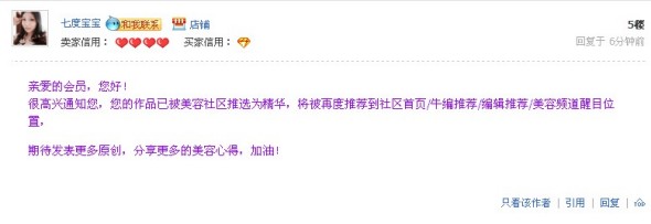 很高兴通知您,您的作品已被美容社区推选为精华,将被再度推荐到社区首页/牛编推荐/编辑推荐/美容频道醒目位置,