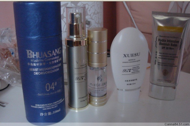 就是这个啦,我的修复敏感肌肤的宝贝,已经用了半年了,蓝色那个是保湿水,是我用过最好的保湿水了,给妈妈买了套她也赞不绝口,说她用过的近千的保湿水都没这个效果好,再后面是修复精华和KGF原液,真两款宝贝赞呆了,我用了半年了这半年内脸都没敏感过,眼睛边上的一个明显的红血丝结已经完全没有了,室友看了都惊奇