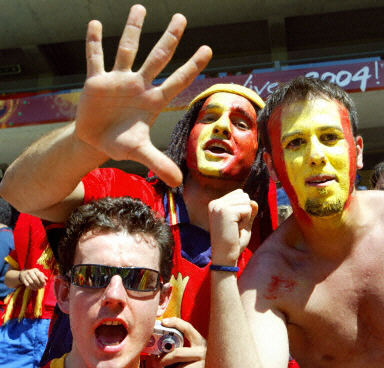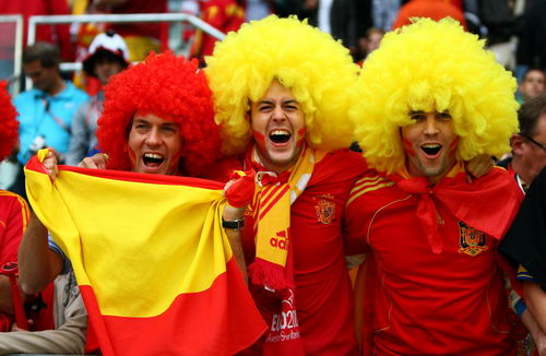 各国球迷都喜欢把国旗等浓墨重彩地涂在身上,让人一看过去,立刻一目了然,立场鲜明。西班牙的国旗色彩明亮,旗面自上而下由红黄红三个平行长方形组成。中间黄色部分占旗面1/2,左侧绘有国徽。红、黄两色是西班牙人民深爱的传统色彩,象征着人民对祖国的一片赤胆忠心。