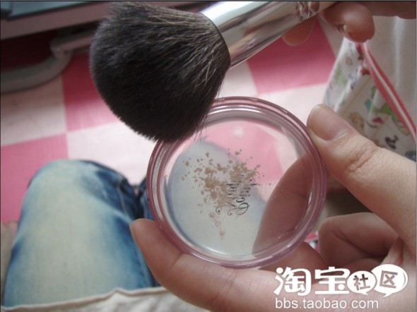 之后用这种大滴散粉刷均匀滴沾取散粉,之后手法很重要哦~刷子垂直在面部不是用画圈而是用轻轻戳滴方式将散粉填进毛孔~一定要均匀并且力气小一些哦~太重戳得痛嘛~呵呵呵`今天我就下重手把瞎仔童鞋戳痛了~有罪啊~