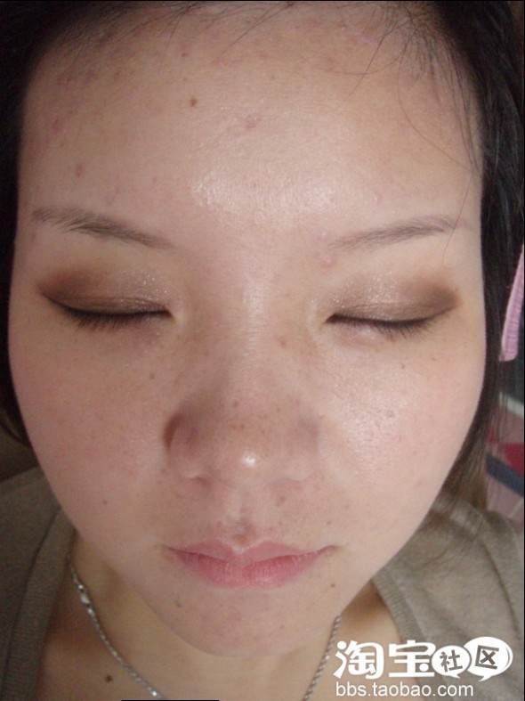 开始最最重要滴底妆吧~因为她额头有痘痘~脸颊有些晦暗~所以这次pinky用了两种颜色滴饰底乳来调节她滴肤色~绿色用来中和痘痘滴红肿,珍珠色用来提亮面部肤色~