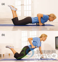 三、侧卧,一只手支着头,一只手扶床,做侧抬腿。注意,脚尖向下,脚跟向上,另一条腿绻起来。速度不要象她那么快,要慢些,不要猛滴把腿抬起来。别做错了,如果做完了,屁屁侧面不酸,你就没做对哦。这个每条腿做20个,最后一个要抬起来后停一会,再换另一条腿,也是做4组。