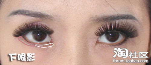 上眼影画完了以后,就该下眼影啦,哈哈~下眼影相对简单的多。只在眼尾处向前画。那有的MM会问,眼头不画吗??哈哈,眼头,我们白色的眼影来提亮啦!