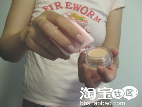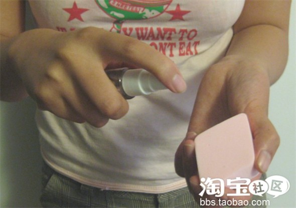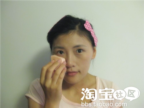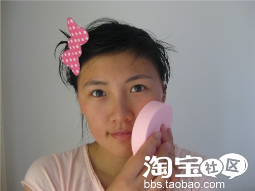 呵呵因为图片较多中间打底霜就不上了,呵呵免得大家看的累。开始上粉底了哦。一定要在粉扑上点水哦,这样粉上上去后会和皮肤很贴拂的哦,一点也看不出擦了很厚的粉哦,而且妆面会很干净、清透哦。