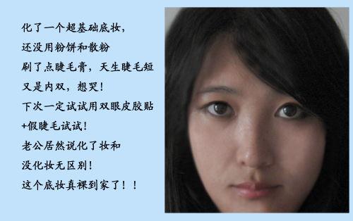 肌肤基础保养过程完毕,接下来可以化一个美美的妆了,我平时化惯了裸妆,没法画出巴西辣妹般的如妖如魅的诱惑浓妆,就是一般的BB霜+遮瑕+睫毛膏+眼线+唇彩~~~简单的几个步骤,一个裸妆出炉!!看看,现在的我是不是精神点了?