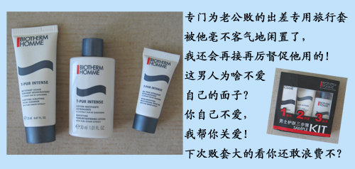 先来展示一下我专门为老公败的碧欧泉旅行中样一套~~~老公太懒,从来不把护肤放在心上,所以我为他准备了出差专用的碧欧泉男士旅行一套,包括 洁面膏,爽肤水,平衡保湿乳!