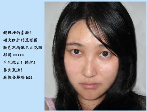 刚洗好脸,肤色不均匀,肌肤毛孔有点粗,鼻头很多雀斑,这次闪光调的好,居然看不太清,可是我水肿的、硕大的黑眼圈还是一览无余!