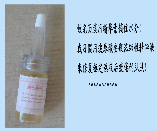 做完面膜,一定会觉得肌肤含水量倍增了!肌肤似乎补足了营养!这时如何有效地锁住肌肤的水分就变得非常重要了。我一般会在熬夜后做完补水面膜后使用玻尿酸安瓶,安瓶作为一种浓缩精华液,能够强有效地修复熬夜后缺水暗沉的肌肤。