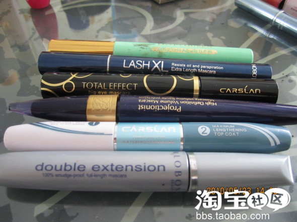 这是我的睫毛膏大集合···第一支是埃及艳后的睫毛纤长纤维,都快用没了··很长时间没用了所以不知道什么效果了都,第二支是雅邦的,不掉色,不晕染,精品国货!(不知道为什么找张娜拉个大棒子做广告··鄙视ing```)第三支是卡姿兰的大眼镜系列的,海胆刷头的哦··速干!不掉色!不晕染!一整天都一个样!真的非常好用啊!赞赞赞··第四支是雅诗兰黛的,老公拜托小叔子在乌克兰买的,但是说实话吧,效果让我很失望!干的很慢,而且要是上班没时间补妆,会掉的很快,还会晕染··55555一点不适合我们亚洲人··第五支还是卡姿兰的,双头的,但是不知道为什么那个白头的用的那么快·
