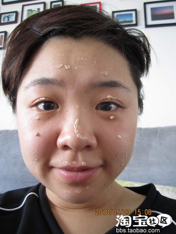 第二步是粉底,要这么一点点的沾上,然后再拍开,一定要均匀的拍开,千万别像抹面霜一样抹开··那就完了··