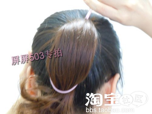 2.用盘发工具大拉拉,大发拉从下向上穿过并把头发装进大发拉的圈子里