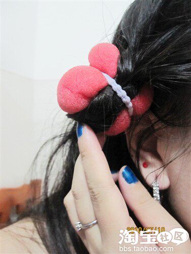 现在想下,卷的时候往外的方向卷应该效果会更好,但原谅自己实践经验也不多,所以。。。再接下来的这一步就是把卷发球一直卷到顶,但是相信大家在使用的过程中会苦于头发很容易松,不稳定吧,于是我想到在上面绑一个小皮筋,