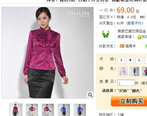 虽然现在不能穿,因为我生完宝宝胖了20斤,不过....是我喜欢的衣服,没道理不抢呀,就算看看,我也开心,而且可以督促我快点减肥呢 呵呵,料子很有垂感,不过容易挂丝,穿的时候要小心的呢,我买的是宝蓝色,更加靓