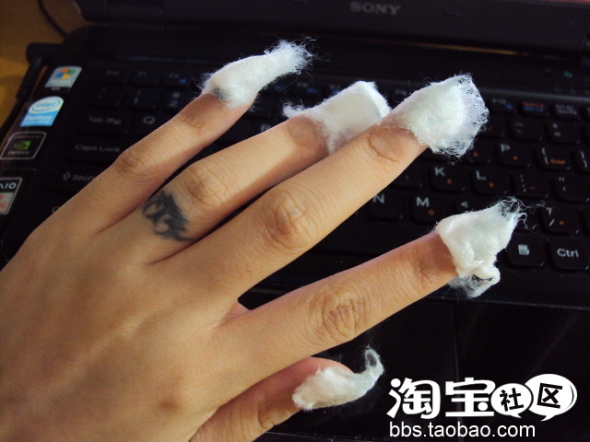 如果有指甲油的话,一定要用棉+卸甲水 敷在指甲上一会儿哦。如果是带亮片的指甲油,时间就要敷得更久点,在待会清洗的时候,就会比较容易!