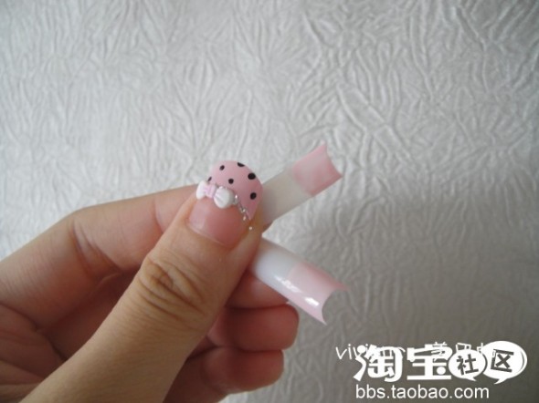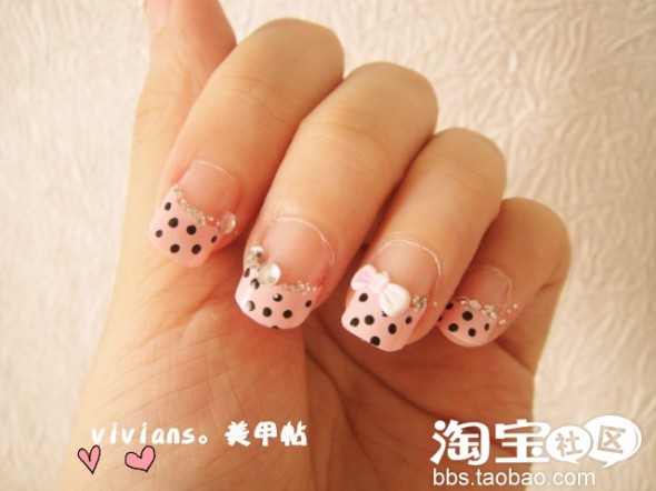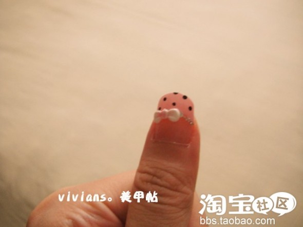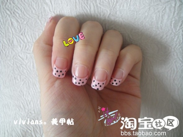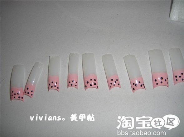 4.等甲片干了之后用点钻笔沾上黑色的指甲油点在甲片上,因为是自己做就没有把过程拍下来了~直接上图