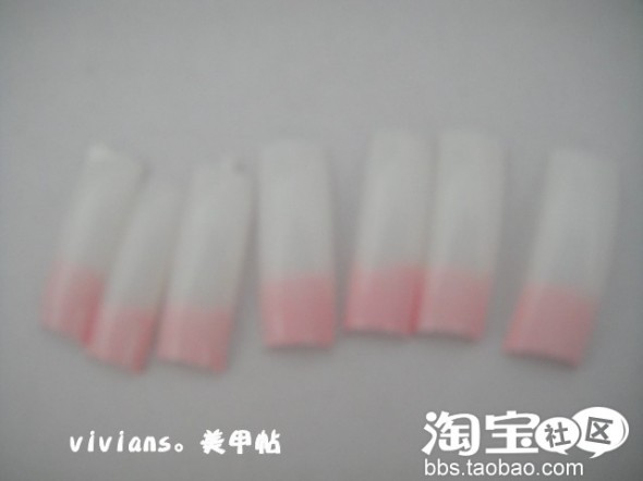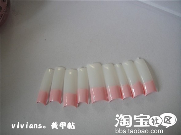 2、把粉色指甲油涂在甲片上,先不要剪断甲片,因为是自己做,留长一点手拿着画比较方便,甲油可以根据自己喜好的长短多涂一点
