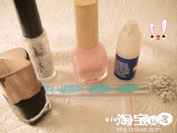 1.材料要用到的是粉粉嫩的指甲油,黑色指甲油,银粉拉线笔,点钻笔,蝴蝶结立体指甲贴,钻钻,胶水,自然色半贴片假指甲,还有忘记拍的亮油和修指甲用的砂纸和指甲剪~~