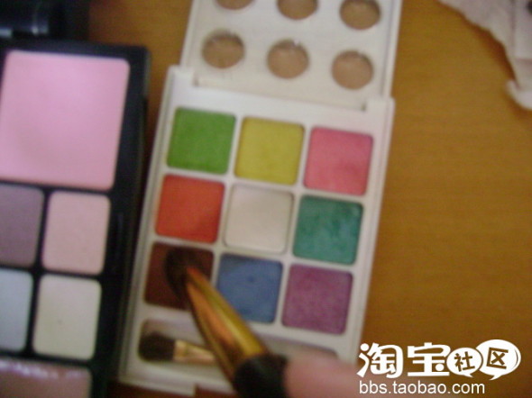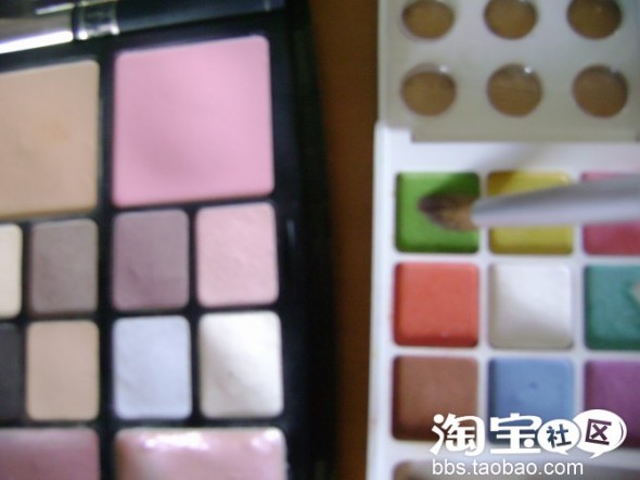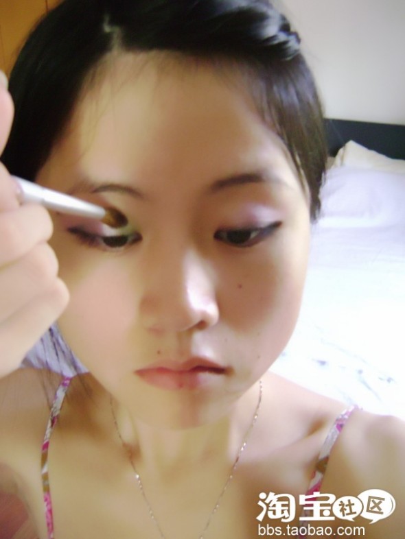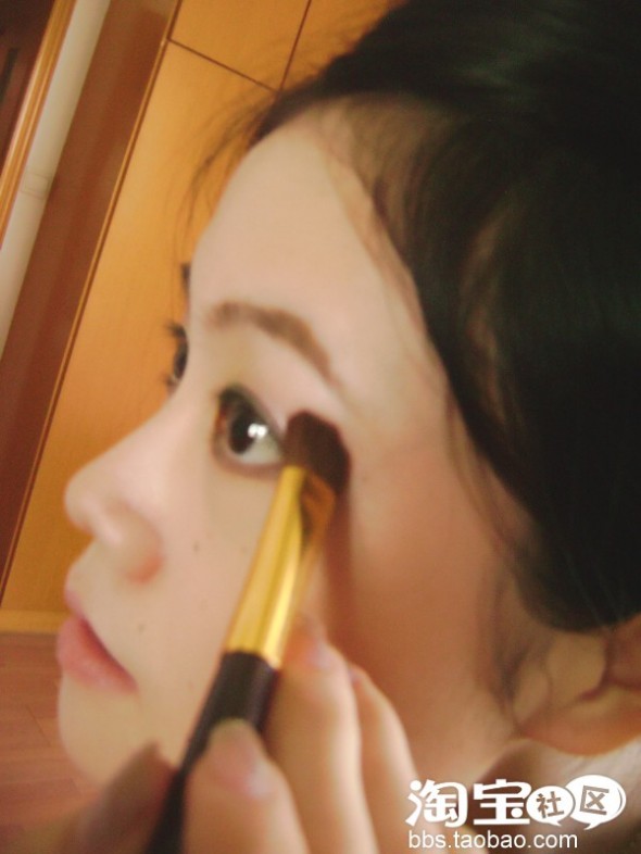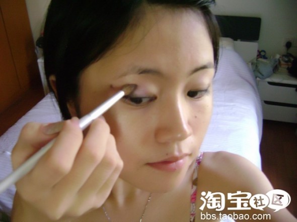 第三 用眼影刷蘸点粉底刷在眼窝上 打个底 之后再蘸点紫罗兰色涂于眼尾部 这个颜色很夏天 我本人相当喜欢 注意 不要涂太多 一点点来