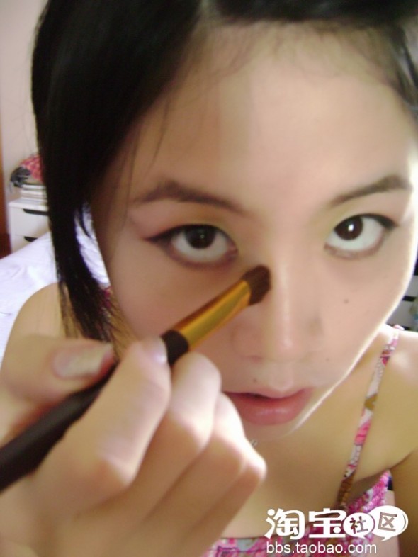 先沾取阴影色(灰 褐 卡其色)涂与鼻翼 要从眉头顺下来 直到鼻孔 颜色千万不要太深 要淡淡的 淡淡的 必要的时候 可以用你的手指将其涂均匀 这样 空出中间细细的鼻梁 我们再涂上高光粉 从眉间一直扫到鼻头 顺便把人中也扫下 有拉长的效果哦