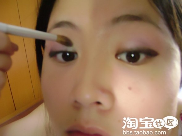 涂好这两种颜色后 要注意在分界处多用刷子刷几下 使之自然 有过渡感 而不是生硬的两片区域 这点相当重要 接下来 我们再蘸点粉色的眼影扫于眼角三角地带 看起来 眼睛甜甜的 这招我百试不爽 哈哈
