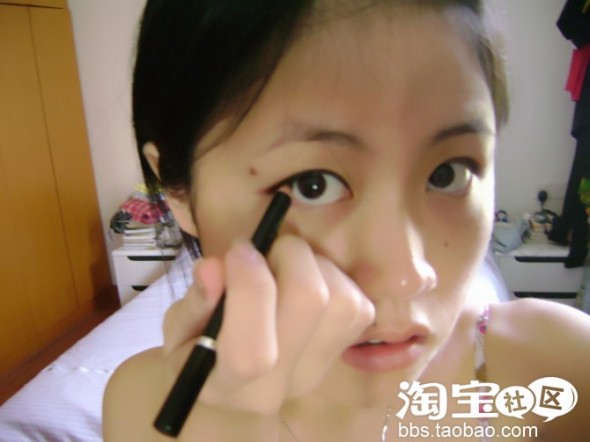 第二 开始描眼线 这期的眼线和第一期“猫眼妆”不一样 抛弃粗 浓 夸张的手法 只要沿着睫毛根部一点点描起来就好 眼尾再顺着延长 如下: