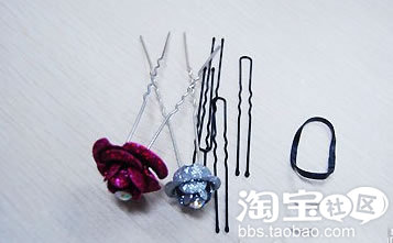 度假风侧盘花朵头需要使用的小工具:U型夹若干,皮筋一根,花朵发饰若干。