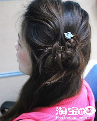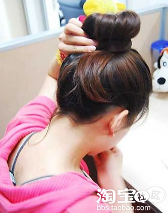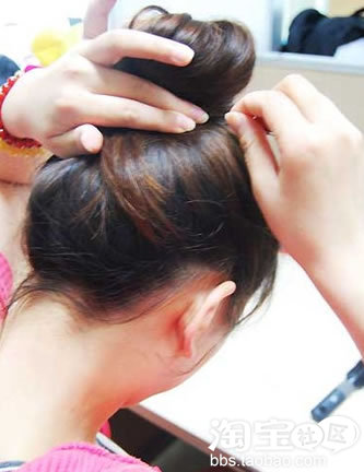 第四步:将头发盘成花苞状后用发卡夹紧尾端的头发。