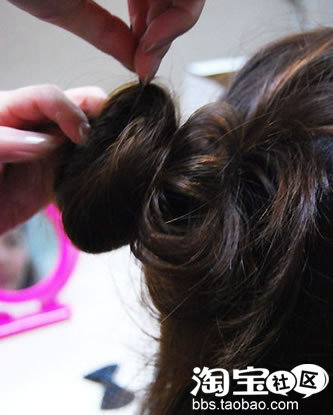 第三步:取出一撮头发,以顺时针方向往一边饶,其余头发也均以顺时针方向往同侧饶。