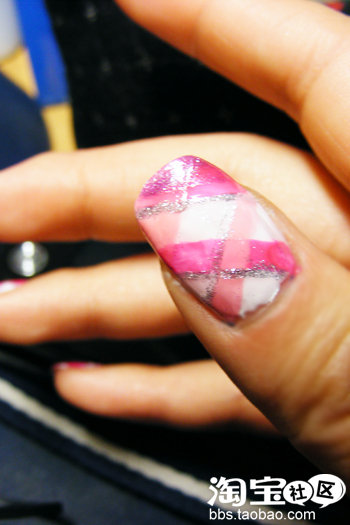 华丽系~~~超简单的 看的明白吧 白底色 交叉画上玫红 再加银边就好了(灯光不好啊 拍的像魔爪~~~忽略我的皱纹吧 其实没有那么多的~~~)