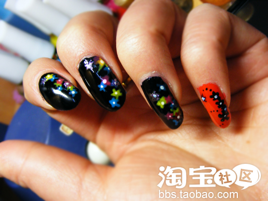 自己超爱的红黑色系浓烈系 很适合冬天的时候~~~各位MM也不要说我光有图没教程啦 这些图都是很久积攒下来滴~~说到方法 因为我工具不全 所以方法都是很简单的 如果是花朵 就是由圆点构成 这个圆点 就是拿棉签沾了甲油再点上去的 至于线条呢 也是用尖头棉签画的 此外就什么都没有了 简单阀~~~~