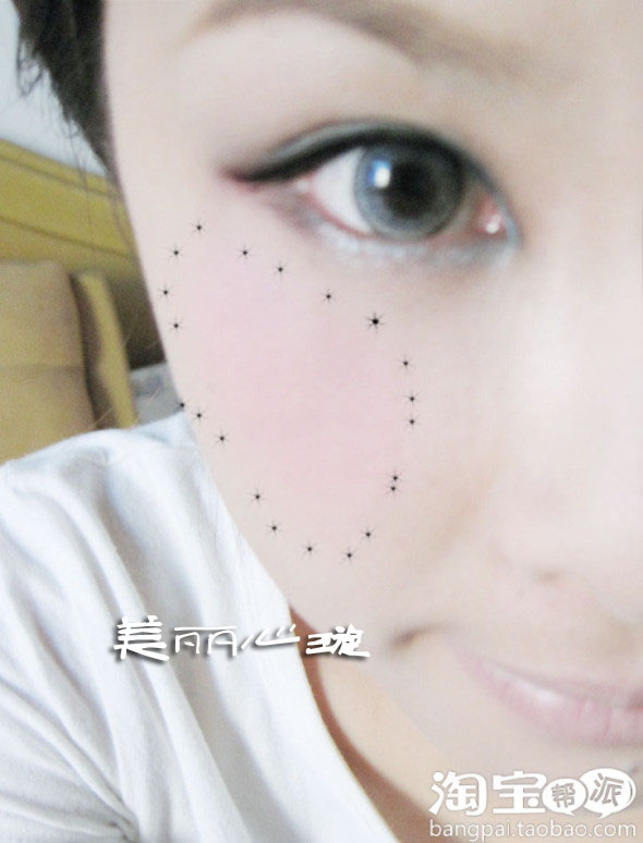嘿嘿 《MM这里一定要注意啊 粉底膏一定要选择与肤色最相近的 要不就会好假哦 经常看到MM 脸白脖子黑 多渗人》 进一步遮瑕后皮肤出现了陶瓷般的效果 一点斑点和黑眼圈都看不主来咯i虽然不够剔透但是等一会粉吃下去就 会很自然 ,嘴唇我也打白了方便后面的操作。